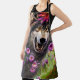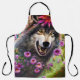 El rojo intenso de la piel del lobo contrasta claramente con la delicada belleza de los pétalos giratorios de flores blancas, amarillas y rosas que adornan su figura.