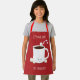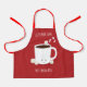 Un delantal rojo con una jarra sonriente de cacao caliente con un bastón de caramelo y varios malvaviscos alegres. El delantal incluye las palabras "¡Tomemos algo de chocolate caliente!" en letras blancas y esas palabras pueden ser personalizadas.