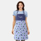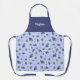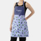 Un delantal con un patrón de uvas, hojas verdes y puntos de polka sobre un fondo morado claro y un nombre de personalizable encima sobre un fondo morado. Un regalo encantador para un vinicultor. También se puede utilizar en una bodega o en un viñedo cuando trabajas.