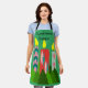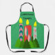Este delantal tiene un diseño Navidad de velas de rectángulos decorados con estrellas, óvalos o diamantes con árboles agrupados alrededor del fondo.