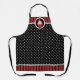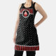 © 2020 Socialite Designs Inc. Atractivo delantal con fondo de polka-punto negro y blanco, franja roja en la línea superior e inferior de la cáñamo, y un quequito de fresa en círculo.