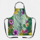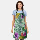 Das Bild zeigt ein lebendiges Mosaik aus üppigen Monstera-Blättern in sattem Grün und Gelb, kombiniert mit prächtigen purpur- und orangefarbenen Blumen, die sich vor einem dynamischen, wellenartigen Hintergrund abheben. Es strahlt eine wilde, tropische Energie und eine fröhliche Fülle aus, die Neugier und Naturverbundenheit weckt.