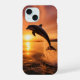 Delicioso y feliz delfín saltando del océano bajo una eterna puesta de sol dorada.