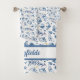 Un elegante patrón marítimo con delfines azules tocando y olas oceánicas. En el medio hay gotas de oro individuales. Lleva el océano a tu baño. Puede cambiar fácilmente el nombre y hacerlo personal.