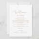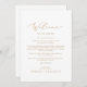 Estas delicadas tarjetas de bienvenida e itinerarios bodas de oro son perfectas para un boda moderno. El romántico diseño minimalista presenta una encantadora y elegante tipografía de champán amarillo dorado sobre un fondo blanco con un aspecto limpio y sencillo. La parte delantera de la tarjeta incluye una carta de bienvenida y la parte trasera de la tarjeta incluye el itinerario del boda. Estas notas son perfectas para bodas de destino y bolsos de bienvenida para huéspedes del hotel.