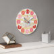 Hermoso ilustracion de un adorable hada bebé dentro de una taza con fresas. El fondo está decorado con rayas acuáticas amarillas y blancas y un purpurina dorado brillante. Las horas de reloj forman una encantadora paleta de color rojo (puede cambiar esos colores haciendo clic en el personalizar más adelante). El nombre del niño está escrito a mano.