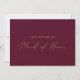 Esta delicada tarjeta de presentación de oro y burdeos es perfecta para un boda moderno. El romántico diseño minimalista presenta una encantadora y elegante tipografía de champán amarillo dorado sobre un fondo rojo burdeos con un aspecto limpio y sencillo. Personalizar la tarjeta con el nombre de la novia y la criada de honor. Personaliza la parte posterior de la tarjeta con un mensaje personalizado.