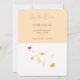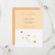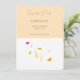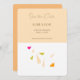 Esta tarjeta de personalizable muestra un conjunto de hojas rosas, verdes y naranjas sobre una superficie blanca, cayendo de la caja superior de salmón que contiene las siguientes palabras en gris: "guardar la fecha", "fecha y lugar" y "invitación formal a seguir".