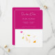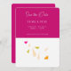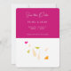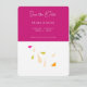 Esta tarjeta de personalizable muestra un conjunto de hojas rosadas, verdes y naranjas sobre una superficie blanca, cayendo de la caja superior morada que contiene las siguientes palabras en blanco: "guardar la fecha", "fecha y lugar" y "invitación formal a seguir".