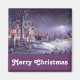 Delicioso imán vintage de Navidad. Elegante calle de nieve morada, de ensueño, tranquila e invernal por la noche, con gente, niños, caballos, muñecos de nieve y luces de la calle afuera de una cálida casa familiar.