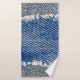 Denim marco. Tejidos de denim despojados con bordes laterales sobre fondo de denim blanqueado, lugar de texto, espacio de copia. Parche de doble color de Jeans Casual. Textura de patrón de denim azul clásico