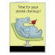 Una imagen divertida para usar en una tarjeta de recordatorio de oficina dental. Un hipopótamo grande se sienta en una silla dental con la boca abierta, mientras un pájaro pequeño se coloca en su barriga sosteniendo un espejo dental listo para hacer un examen. La leyenda dice: "¡Hora de tu chequeo dental!" Diseño original de Christie Black de Creations from the Heart.