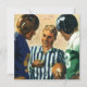 Ilustración vintage de fútbol americano con dos jugadores de fútbol y el árbitro sosteniendo la pelota a punto de lanzar una moneda para ver quién inicia el juego de fútbol. ¡Es hora de jugar!