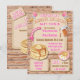 Súper lindo Desayuno o Brunch Baby Shower Invitaciones con una gran pila de crepes, un plato azul de huevos y bacon, jarabe de verter y rattles de bebé sobre papel vintage contra un fondo rústico de madera. ¡Una idea muy divertida para una ducha de bebé chica!