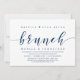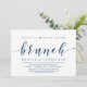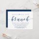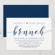 Tarjeta de invitación de boda con tema azul marino elegante y letra moderna (Desayuno Brunch Felices Para Siempre). Es perfecta para su celebración de boda informal a orillas de un lago.