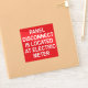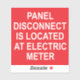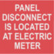 Un pegatina para electricistas para etiquetar paneles eléctricos remotos. El pegatina rojo con letras blancas dice: "EL PANEL DESCONECTAR ESTÁ UBICADO EN EL METRO ELÉCTRICO".