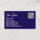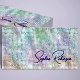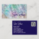 Una tarjeta de visita con un diseño purpurina holográfico de bonito con texto azul en la parte delantera. La parte posterior presenta un fondo azul con texto blanco.