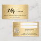 Un fondo falso de aspecto dorado, texto negro. Al frente: Añade tu descuento. fecha válida. Atrás: Personaliza y agrega tu nombre de negocio, número de teléfono, correo, dirección de sitio web, código qr a tu sitio web o cuenta de medios sociales.