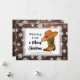 ¿Estás buscando una tarjeta de Navidades de estilo rural para desear a tus amigos y familia una Feliz Navidad? Aquí hay una dulce tarjeta con gráficos de botas de vaquero con un agujero en ellas, gorra de vaquero, y el texto, "Deseando una Feliz Navidad. Madera rústica y fondo de copas de nieve.