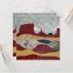 Un paisaje abstracto con colores y texturas únicos que muestran una escena desértica con un sol azul que se eleva y un cactus en tonos rojos, grises, beige y azul.