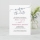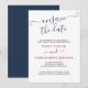 Simple y Elegante Desguardar la tarjeta de actualización de fecha, Boda para notificar a los invitados el aplazamiento de su boda. El diseño es azul marino, borgoña y blanco con elegantes letras a mano y elegantes fuentes serif. El texto de la muestra dice: "Lamentamos anunciar que debido a acontecimientos recientes el boda de [sus nombres] ha sido pospuesto. Te avisaremos en cuanto fijemos una nueva fecha. Fue una decisión difícil y les damos las gracias por su comprensión". La plantilla está preparada para que añada sus nombres y edite la mayor parte de la cuenta de aplazamiento que desee.