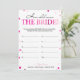 Este juego moderno de "¿Cuántos años tenía la novia?" presenta un fondo magenta rosa con confeti metálico. El texto está escrito en una mezcla de una fuente de caligrafía juguetona y una fuente serif moderna, esta tarjeta está personalizada con el nombre de la futura novia y la fecha de la despedida de soltera.