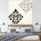 El diseño del damasco pergamino y hoja se repite en los detalles en negro y gris sobre un fondo de color crema.