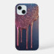 El brillo rosa brillante se derrite en gotas brillantes sobre un fondo azul, combinando el brillo estrellado y las texturas de pintura líquida para un aspecto glamuroso, soñador y de fantasía abstracta adecuado para proyectos de belleza y lujo.