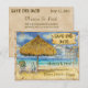 Este "Destination Paradise", Save the Date de dos caras está hecho de hermoso arte coloreado a mano con agua por Audrey Jeanne Roberts. Cuenta con exquisitamente detallado Palappa en elegantes marcos tropicales, con fondos de "pergamino" envejecido y delicados giros pintados a mano en crema en el frente y marrón dorado en el reverso. La paleta de colores es azul aqua, bronceado, crema y marrón. También disponible con un fondo verde musgo suave, verde más oscuro y un fondo azul aqua más oscuro. Esta tarjeta de Save the Date se puede personalizar fácilmente. TAMBIÉN PODRÍAS DISFRUTAR: TARJETAS DE BODA: