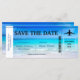 Una imagen tropical de la playa es el fondo para este pasaje de embarque de destino de boda Guardar la fecha.