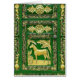 Fotografía de una tradicional caravana gitana pintada de caravana con un caballo de oro sobre un fondo pintado de verde, fotografiada en la feria de caballos Appleby, en Cumbria, Inglaterra, donde los gitanos se reúnen cada año.