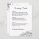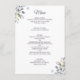 Romántico azul polvoriento floral diseño botánico moderno ideal para bodas de primavera o verano. Detalles del boda combinado en la parte delantera y menú en la parte posterior.