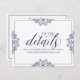 Elegante Tarjeta de detalles de bodas de vintage Insertar - Nadine (Azul marino): Estos elegantes detalles de boda insertan coordenadas perfectamente con nuestra suite de invitaciones Nadine. El color de diseño está establecido en azul marino, pero puede cambiar el color del diseño cambiando el color de fondo. **CÓMO CAMBIAR EL COLOR DE DISEÑO** 1) Haga clic en el botón "Personalizar". 2) Haga clic en el enlace "ClICK TO PERSONALIZAR FURTHER" en la parte inferior. Entonces tendrá la opción de cambiar su "COLOR DE FONDO" a su color boda. No olvides cambiar el color del texto para que coincida con tu diseño.