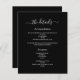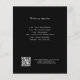 Detalles/programa/cronología de una boda moderna y elegante. Un fondo negro. Personalice y agregue sus nombres y detalles del boda. Letras de color blanco. Texto en ambos lados. Agregue la dirección URL de su sitio web boda al código QR. 1 hoja = 1 programa de borde a borde impreso.