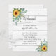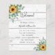 Un programa de bodas moderno, elegante, cronología. Madera rústica blanca como fondo. Decorado con girasoles, vegetación de eucalipto de color verde agua. Personalice y agregue sus nombres y detalles del boda. Letras de color negro. Si tiene más texto, es posible reducir el espacio de línea y eliminar la decoración de la parte posterior.