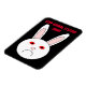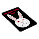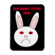 Este imán impresionante presenta la cara triste de un conejo blanco. Este conejo tiene un gran fruncido en la cara porque es un conejo de laboratorio que ha tenido cosméticos probados. Los blancos de sus ojos son rojos e hinchados. El diseño ha sido creado para llamar la atención sobre el sufrimiento innecesario causado por los ensayos de cosméticos en animales.