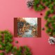 Esta imagen captura un pintoresco y acogedor pueblo enclavado en el corazón del otoño. El camino de adoquines serpentea a través de encantadoras casitas de campo con cálidas paredes de tonos naranjas, techos empinados de pizarra y macetas repletas de flores rojas. El humo se riega suavemente de las chimeneas, lo que indica un frío en el aire y el calor de la casa. La gente se reúne en una pequeña cafetería, disfrutando de los asientos al aire libre, mientras que las bicicletas y los puestos de mercado le dan vida a la tranquila escena. Los árboles, vestidos con brillantes colores caídos, cubren el paisaje en tonos dorados, naranjas y rojos. Una farola añade un encanto de antaño.