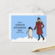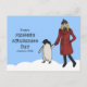 Una encantadora chica rubia con un abrigo rojo saca a su pingüino a dar un paseo para celebrar el Día de la Conciencia del Pingüino - 20 de enero