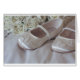 dos zapatos pequeños bodas para una dama de honor o un chica floral de seda marfil con un ramo detrás