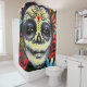 Día floral vibrante de la imagen muerta en una cortina de ducha preciosa. Las flores entonadas joya rica rodean la cara de una mujer pintada para el día mexicano de los muertos. Tarde el tiempo para oler los rosas…