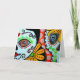 Esta tarjeta tiene una imagen de una de mis pinturas llamada "Dos Caras". Mi inspiración para todo mi trabajo viene de mi país (México) y esto en particular se inspira en la celebración del Día de Muertos. En esta celebración recordamos a nuestros seres queridos con felicidad y respeto.