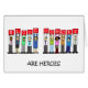 Un grupo de personalizados de diferentes etnias parados seguidos. Están sosteniendo tarjetas cuadradas rojas con letras blancas en ese deletreo "Donantes de sangre". Debajo de la imagen están las palabras 'Son héroes'.