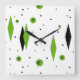 Este personalizable Retro Green Diamonds y Starbursts Square Wall Clock es una nueva versión de un estilo vintage. Cuenta con estrellas kitsch, negras, sobre puntos de polka verde, con formas geométricas, verdes y de diamante negro. Personalizar el color de fondo de este producto moderno de mediados de siglo si te sientes atrevido, o déjalo blanco si es sobrio es más tu estilo. Seguramente disfrutarán nuestro homenaje a los años 50. Compra esto hoy y sé el gato más genial de tu cuadra.