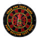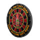 Diseño de tablero rojo oscuro, negro, verde y naranja. Cada color es personalizable. Letras CALIENTES con el O hecho con una botella de salsa de pimienta. Dos áreas de texto personalizado en el anillo exterior.