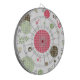 Un elemento giratorio de forma circular con círculos de color rosa, verde y marrón de gingham y lindas flores y formas de margarita retro.
