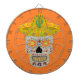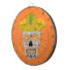 Este impresionante dart board presenta una imagen de diseño gráfico de un cráneo inspirado en el Día de los Muertos de México. El cráneo es de color gris pálido y lleva un sombrero amarillo. Tiene dientes de oro y girasoles mexicanos, también llamados Tithonias< en lugar de ojos. El sombrero tiene un cactus encima y está cubierto por motivos de remolinos de bonito y pimientos de chile rojos y verdes. El cráneo está cubierto de flores de color bonito de diferentes tipos.