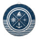 Diseño de temática náutica con símbolos náuticos (ancla, velero, velero, brújula) en fondo blanco y azul marino a rayas.