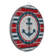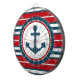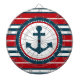 Diseño náutico con decoración de ancla en forma redonda sobre fondo rayado rojo, azul y blanco
