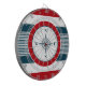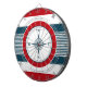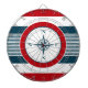 Diseño náutico con decoración de brújula en forma redonda sobre fondo rayado azul, rojo y blanco
