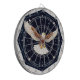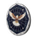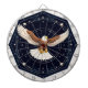 Ilustracion de un águila que se eleva en un ambiente celeste nocturno, adornado con estampados estelares detallados y motivos cósmicos de composición simétrica.